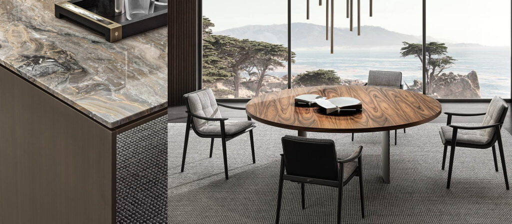 Marcio Kogan (Studio mk27) ontwierp ook Superquadra, een serie met opbergmeubelen, tafels, banken en salontafels in donkerbruin gebeitst Santos palissander. De ontwerpen vallen op door hun pure, geometrische vormen die de subtiele combinaties van materialen benadrukken, waardoor een verfijnd contrast ontstaat tussen hout, aluminium, marmer en gecapitonneerde volumes.