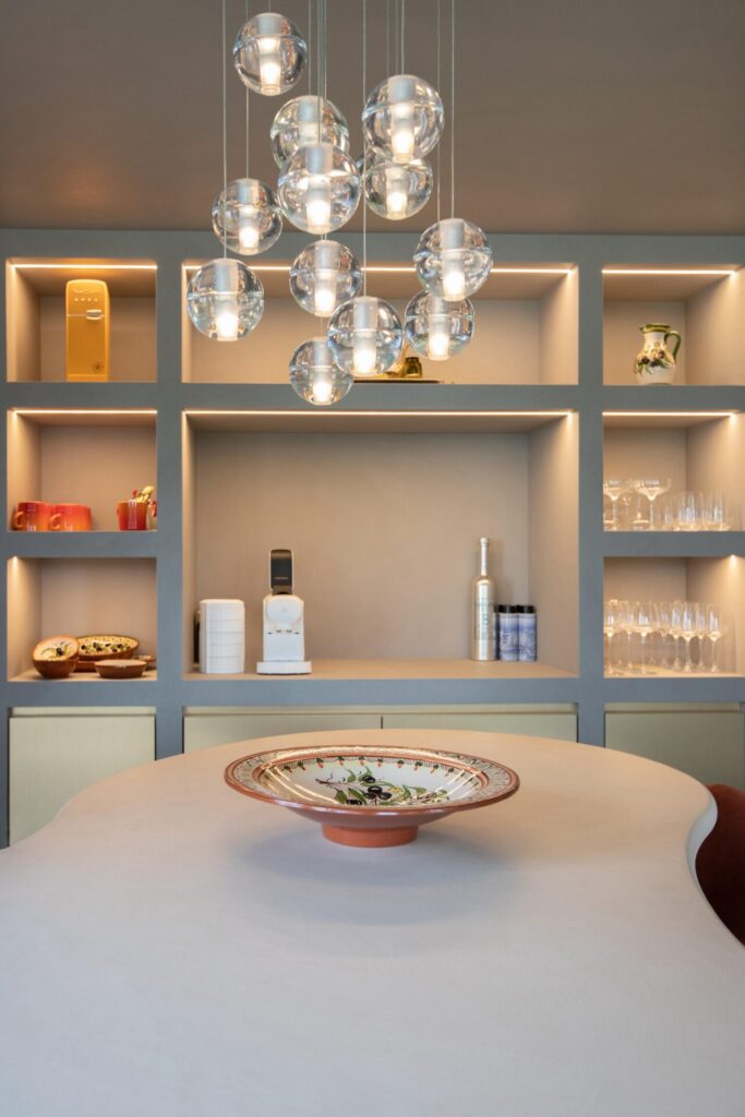 De maatwerk bartafel vormt het centrale ontmoetingspunt, omringd door de elegante Gemma barstoelen van Baxter, die comfort en esthetiek naadloos combineren. Boven de tafel zorgt de iconische Bocci 14 hanglamp voor een warme, intieme verlichting die de ruimte een zachte gloed geeft.
