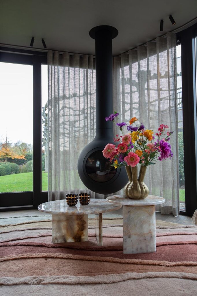In de living, gericht op de tuin en haard, vormt de Baxter Tactile sofa het onmiskenbare middelpunt. De sculpturale vormen en het rijke leder van Baxter geven de ruimte een warm en uitnodigend karakter, terwijl de elegante rondingen perfect aansluiten bij de organische lijnen van de tafel in het bargedeelte. Onder de sofa ligt een kleurrijk vloerkleed van Limited Edition, dat met zijn levendige, gelaagde tinten extra diepte toevoegt.