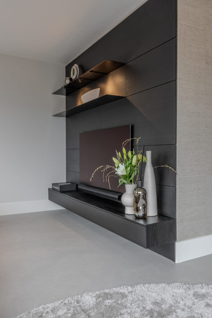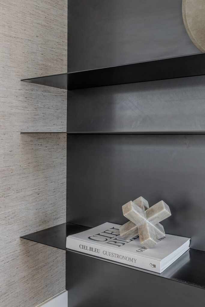 Op diverse plekken in de woning is gekozen voor de strakke en tijdloze wandsystemen van het Italiaanse merk Porro, waaronder het veelzijdige model Load-it. Deze modulaire systemen bieden maximale ontwerpvrijheid, waardoor alle wensen van de klant naadloos in het interieur konden worden geïntegreerd. Zo zijn de haard en televisie op elegante wijze opgenomen in het totaalontwerp, zonder afbreuk te doen aan rust en balans in de ruimte. Tegelijkertijd bieden de Porro wandsystemen ruimte voor het presenteren van persoonlijke accessoires en objecten, waardoor functionaliteit en esthetiek perfect samenkomen in een harmonieus geheel.