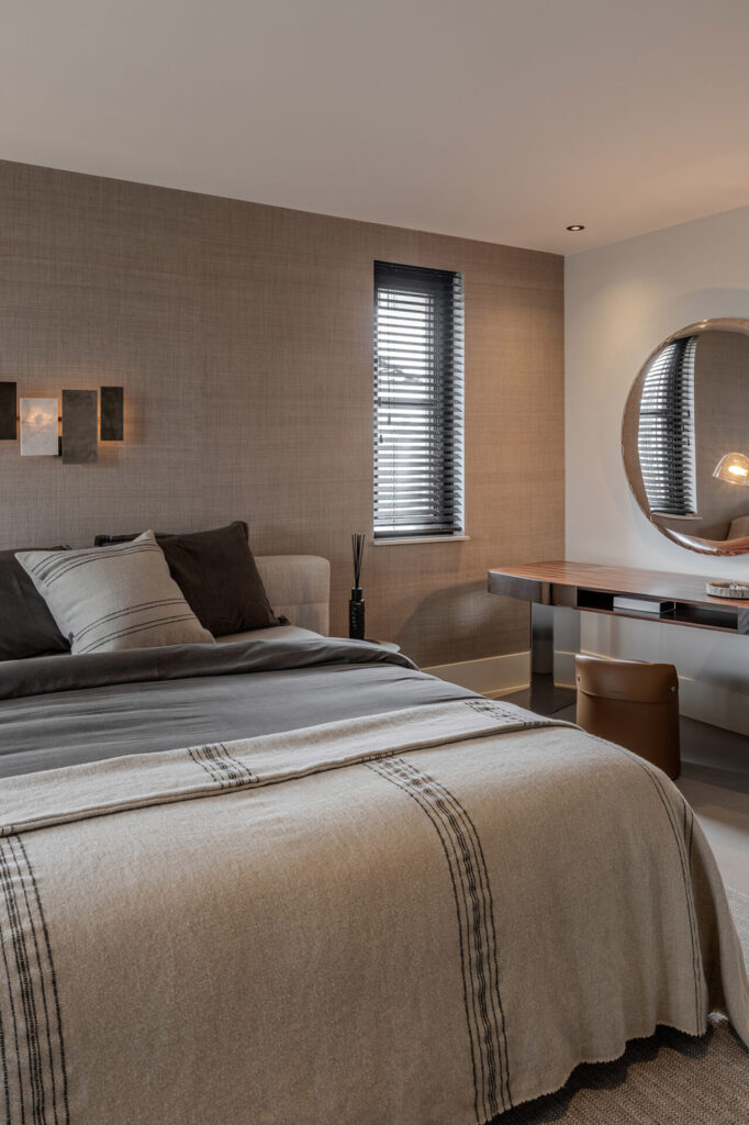 De slaapkamer is ontworpen als een serene vijfsterren hotelsuite, waar rust, luxe en comfort samenkomen. Het middelpunt van de ruimte wordt gevormd door het elegante Minotti Lawrence bed, schitterend opgemaakt in een zorgvuldig gekozen kleurstelling en afgewerkt met exclusief bedlinnen.