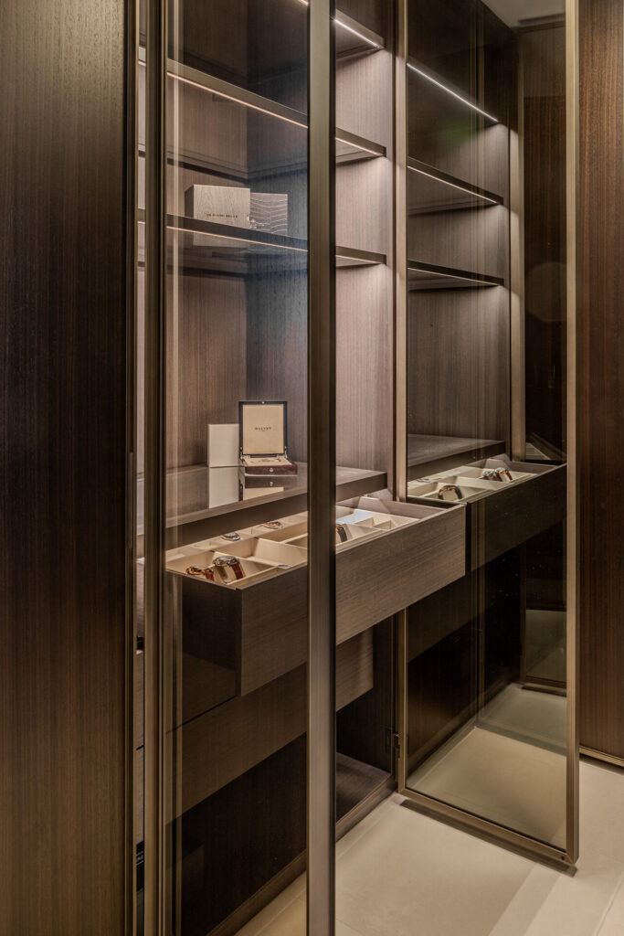 Het stijlvolle Minotti Diagramma bureau versterkt het hotelgevoel, terwijl de artistieke wandlamp van Henge boven het bed zorgt voor een subtiel sculpturaal licht-accent. De slaapkamer vloeit naadloos over in de badkamer en leidt vervolgens naar een op maat gemaakte Porro inloopkast, waarmee luxe, comfort en functionaliteit in perfecte harmonie samenkomen.