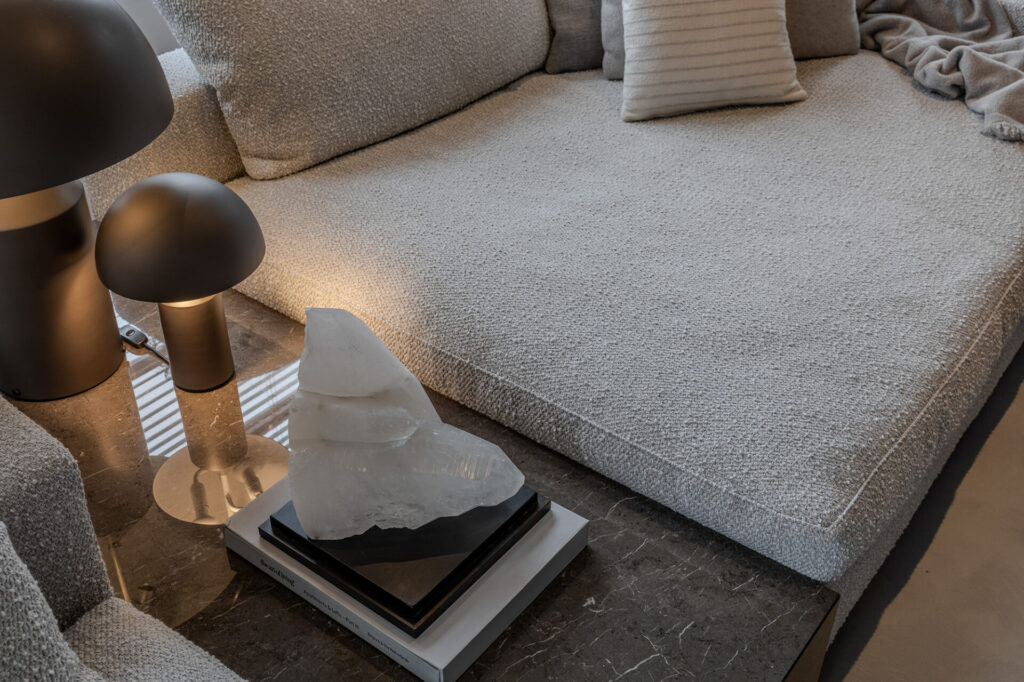 Om het geheel luchtig en ruimtelijk te houden, maakte Peter een bewuste keuze voor twee verschillende nachtelementen: een functioneel Minotti nachtkastje met opbergruimte en een verfijnde Minotti Cesar bijzettafel, die lichtheid en balans toevoegt aan het ontwerp.
