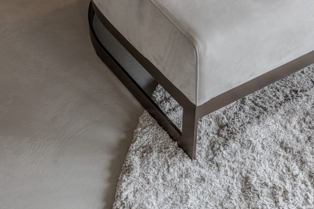 Onder het bed is een verfijnt vloerkleed van Limited Edition geplaatst, via onze partner QiiD. Dit vormt een mooi contrast met de Lava Stone vloer van onze andere partner Van Hollandse Bodem.