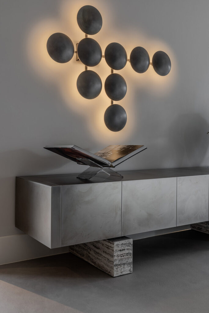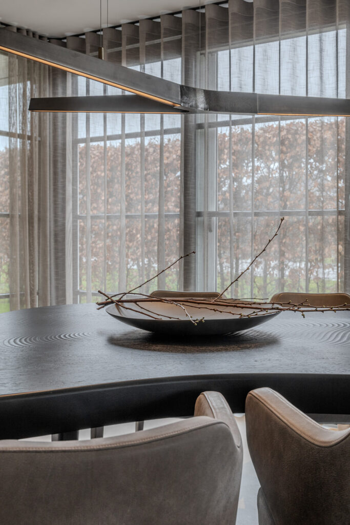 Absolute eyecatchers binnen dit interieur zijn de exclusieve ontwerpen van het Italiaanse designmerk Henge. Dit bijzondere merk beweegt zich op het snijvlak van kunst en meubelontwerp en staat bekend om zijn sculpturale benadering en verfijnde materiaalgebruik. De lichtobjecten van Henge zijn geen traditionele armaturen, maar ware kunstobjecten die sfeer en karakter toevoegen aan de ruimte. Voor deze woning adviseerde Peter de indrukwekkende Henge Wallclips, gecombineerd met de iconische Henge Starlight boven de Linteloo Isola eettafel. Daarnaast vormt het unieke en prachtig afgewerkte Henge Slim Side dressoir een stijlvol statement, waarin vakmanschap, materiaal en design samenkomen tot een tijdloos geheel.