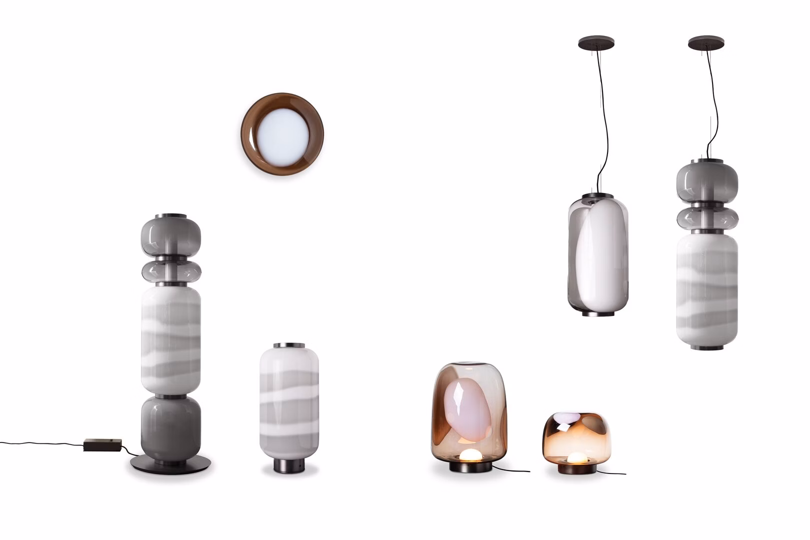 Baxter Haiku is een verfijnde serie lampen die elegantie en modern design op unieke wijze combineert. Vervaardigd uit geborsteld nikkel en voorzien van lampenkappen in bruin of grijs gehard transparant geblazen glas.