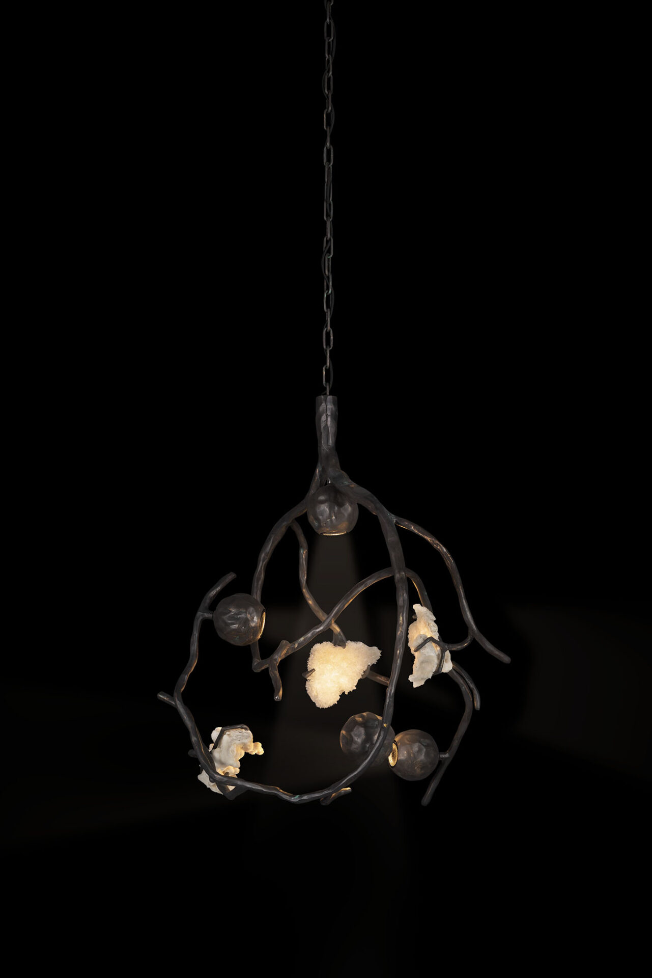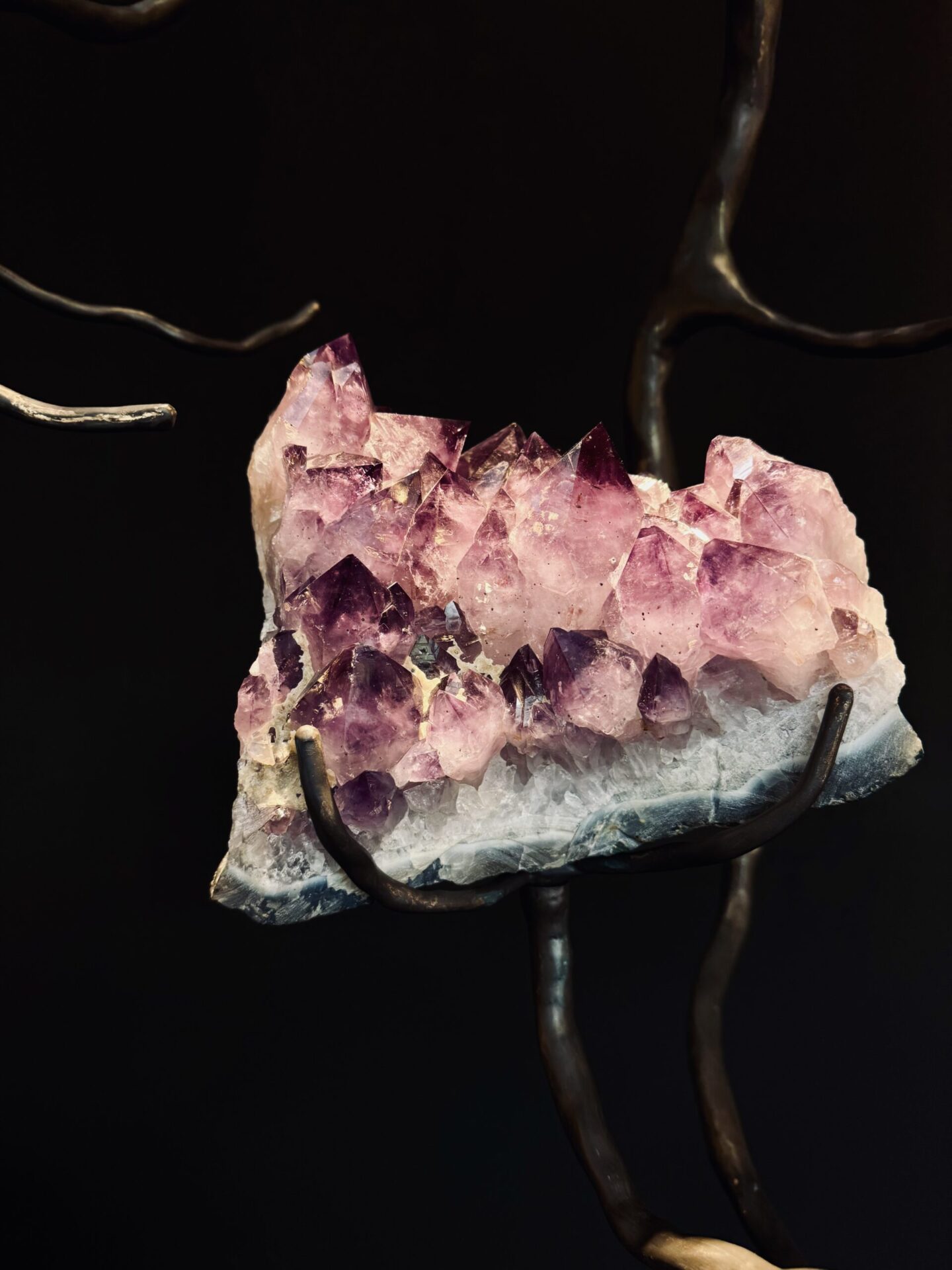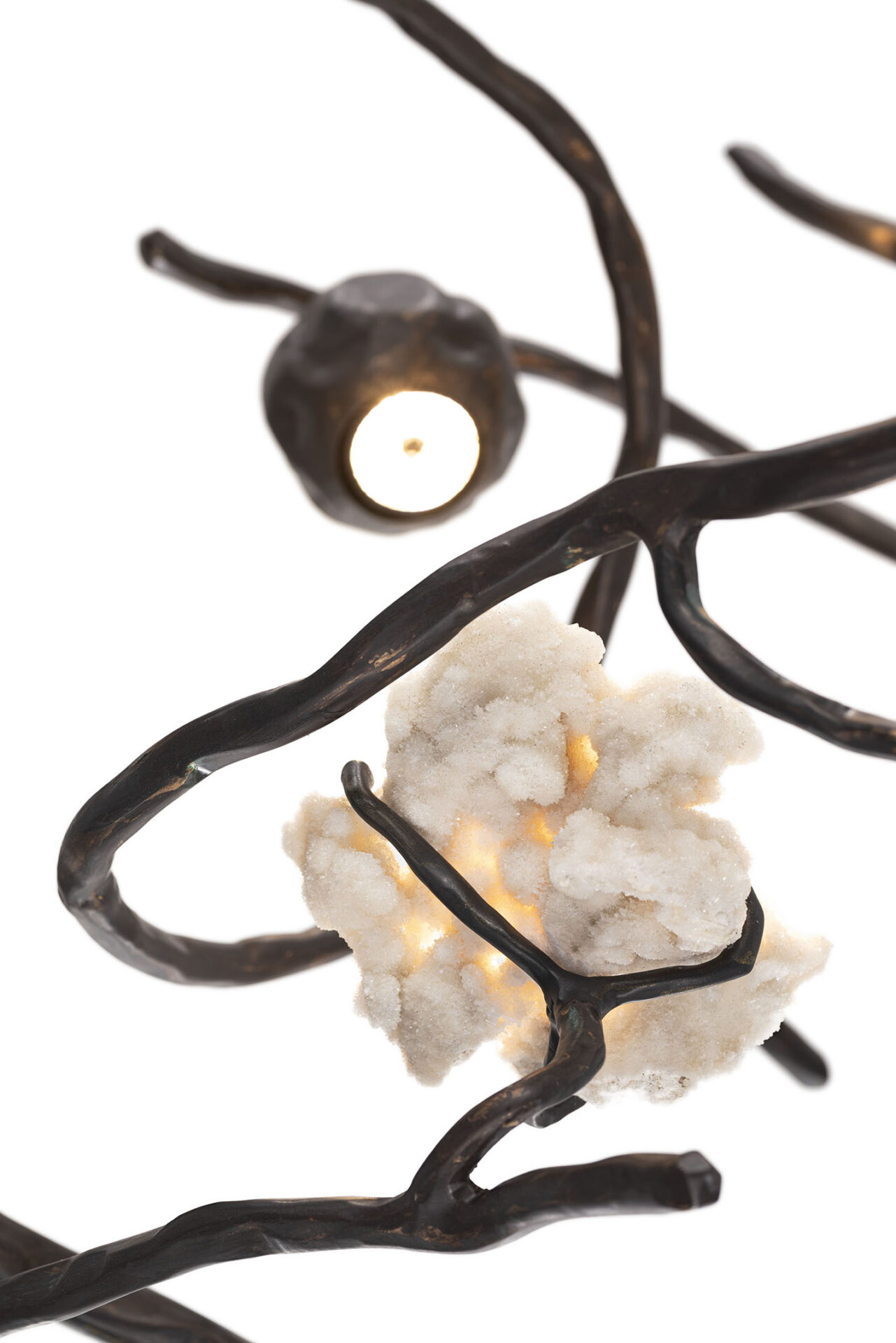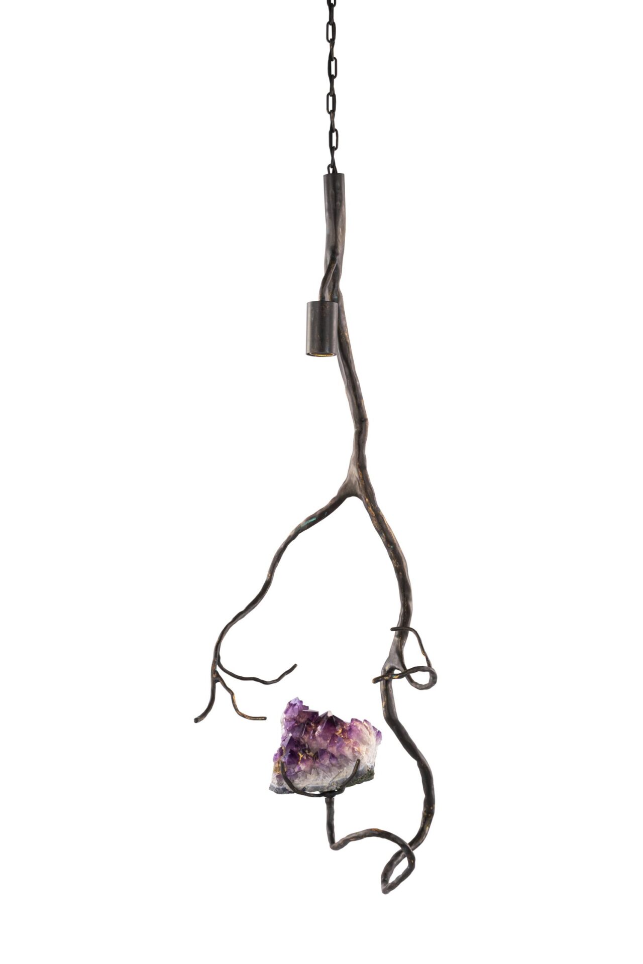 Een bijzonder aspect van de Brand van Egmond Orpheus is de integratie van halfedelstenen en zeldzame mineralen, geïnspireerd op de Griekse mythe van Orpheus. De dichter wiens muziek zelfs stenen wist te betoveren. In deze collectie worden ruwe, onbewerkte stenen zoals amethist, labradoriet, malachiet, pyriet en bergkristal zorgvuldig geselecteerd en verweven in een sculpturaal geheel van met de hand gesmeed metaal met een diepe Bronze Dark Patina afwerking. Dit geeft elk object een bijna tastbare energie, alsof het zacht pulseert in de ruimte. Voor een nog persoonlijker karakter kan de Orpheus zelfs worden verrijkt met een eigen, dierbare steen, waardoor een uniek kunstobject ontstaat dat volledig aansluit bij uw persoonlijke smaak.