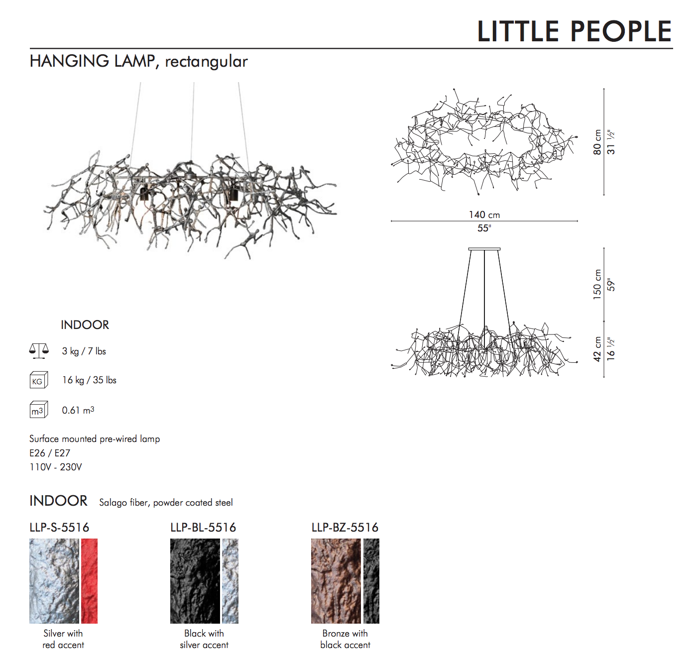 Honderden individuele beeldjes belichamen de speelse aard van de Little People. Salago-vezels worden met de hand aan elkaar gezet om volume en body te geven aan een sculpturale compositie van staal. Het resultaat is zowel dramatisch als betekenisvol, en laat zien wat er gebeurt wanneer mensen zich verenigen en samenwerken. Onderstaand de verschillende uitvoeringen van deze Little People hanglamp.