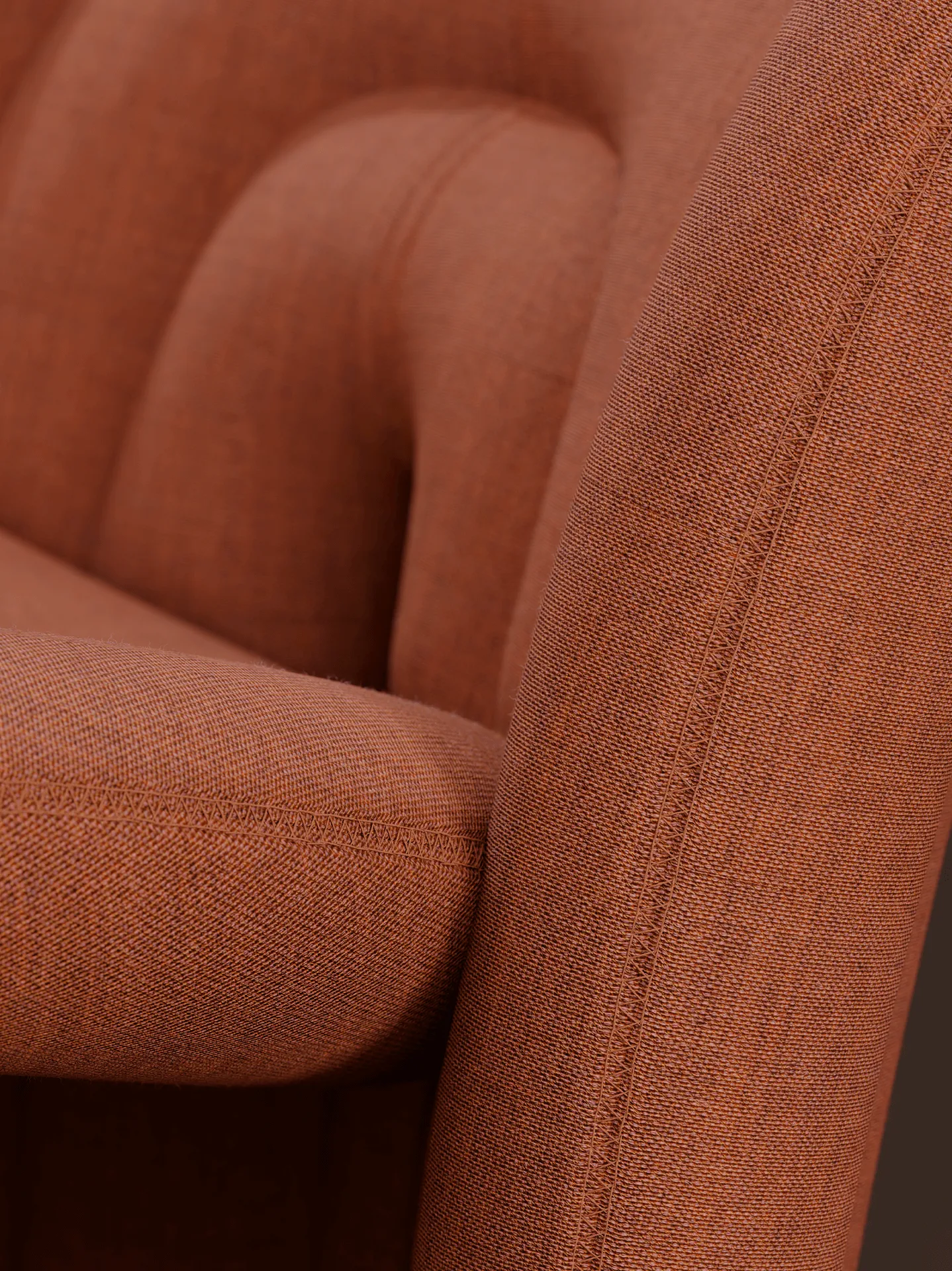 Deze ritmiek brengt een esthetische rust in het ontwerp. Op het eerste gezicht ogen de lijnen eenvoudig en sereen, maar juist in die ogenschijnlijke eenvoud schuilt de complexiteit. Alleen dankzij het uitzonderlijke vakmanschap van Leolux is het mogelijk om deze vloeiende vorm met zoveel precisie te realiseren. Elke overgang, ronding en naad is zorgvuldig uitgewerkt, waardoor de fauteuil zowel visueel licht als constructief solide aanvoelt.