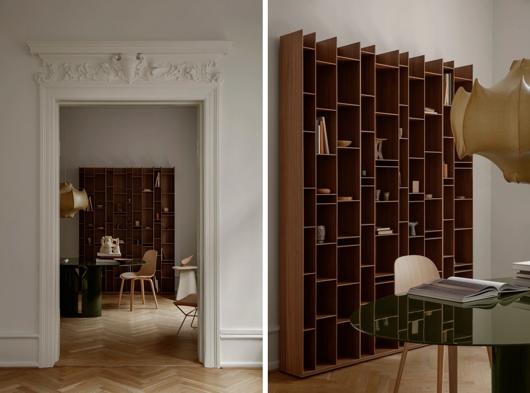 Een boekenkast gemaakt van 6 mm dikke houtvezelplaten van gemiddelde dichtheid, met matte lak (micro-gofferd) in wit of middengrijs, en achterkant van met melamine gecoat karton (dikte 10 mm).