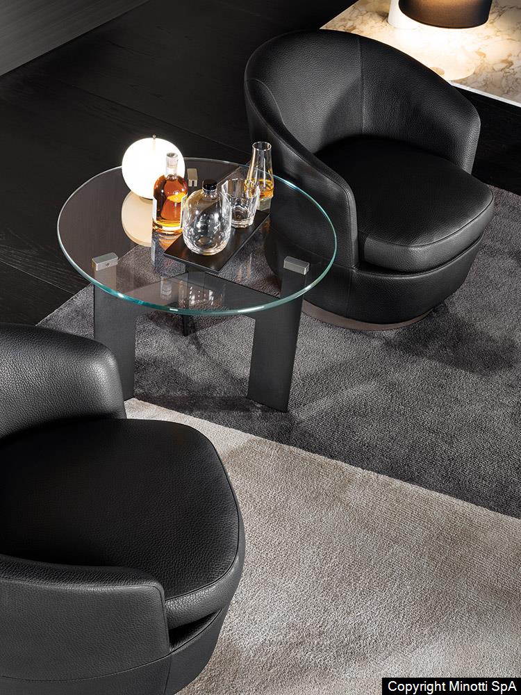Minotti Ellis salontafel is een serie bijzettafels met bladen van extra helder glas of gerookt grijs glas met afgeronde rand. De salontafel met een diameter van 30 cm is daarentegen alleen verkrijgbaar in een volledig metalen versie.