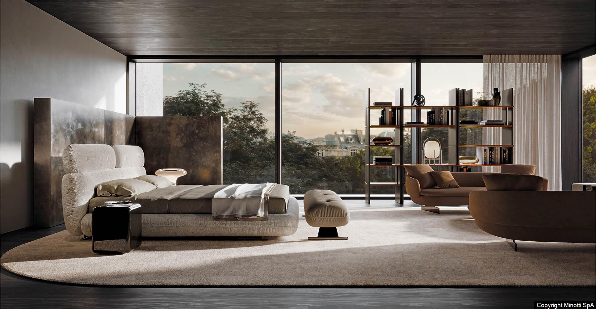 Wat het Minotti Libra bed echt onderscheidt van andere luxe bedden, is het harmonieuze spel van volumes: de licht afgeronde vormen van het hoofdbord contrasteren op elegante wijze met het strakke, zwevende frame. De modulaire opbouw en hoogwaardige binnenstructuur garanderen jarenlang uitzonderlijk comfort en ondersteunen een hoogwaardige slaapervaring die past binnen een veeleisende levensstijl.