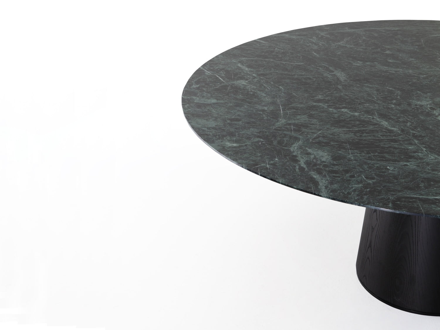 De Materic tafel, ontworpen door Piero Lissoni, is een sculpturaal object waarbij de absolute eenvoud van het ontwerp wordt gecombineerd met de verfijning van materialen en vakmanschap. Materic heeft een rond, taps toelopend tafelblad, dat steunt op een gedraaide afgeknotte kegel als voet. De top wordt geleverd in marmer, verkrijgbaar in 6 nuances, variërend van ‘’verde rameggiato’’ tot het meer traditionele witte Carrara marmer. Het tafelblad kan ook een roterende lade in het midden hebben. De tafel is verkrijgbaar in twee maten, diam. 160 cm en diam. 180 cm, beide vast of met een roterende centrale schijf. Dankzij de royale afmeting kunnen er 6 of 8 personen comfortabel aan deze tafel zitten.