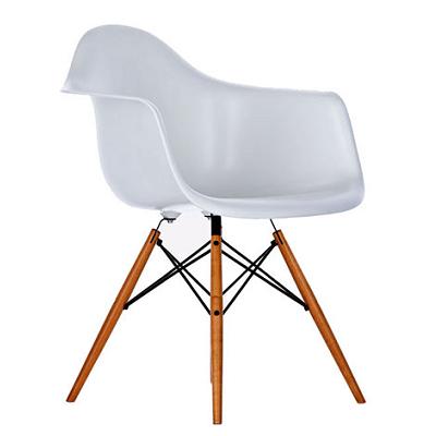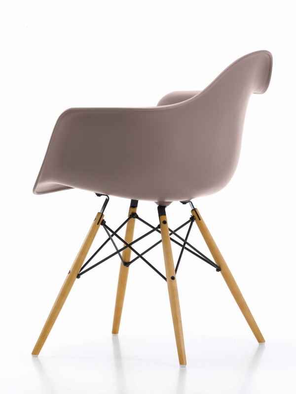 Vitra DAW stoel ontworpen door Charles & Ray Eames in 1950. Een kunststof schaal op een esdoorn draadonderstel. De Vitra DAW stoel is eenvoudig qua belijning, maar zit verrassend goed. De Vitra DAW is de iconische plastic chair met de geelachtige esdoorn omhulsels van de voet. De Vitra DAW eetsotoel is tegenwoordig ook leverbaar met zitkussens, vooral in de wintermaanden is dit een fijne optie, omdat het de kunststof schaal minder kil maakt om in te zitten.