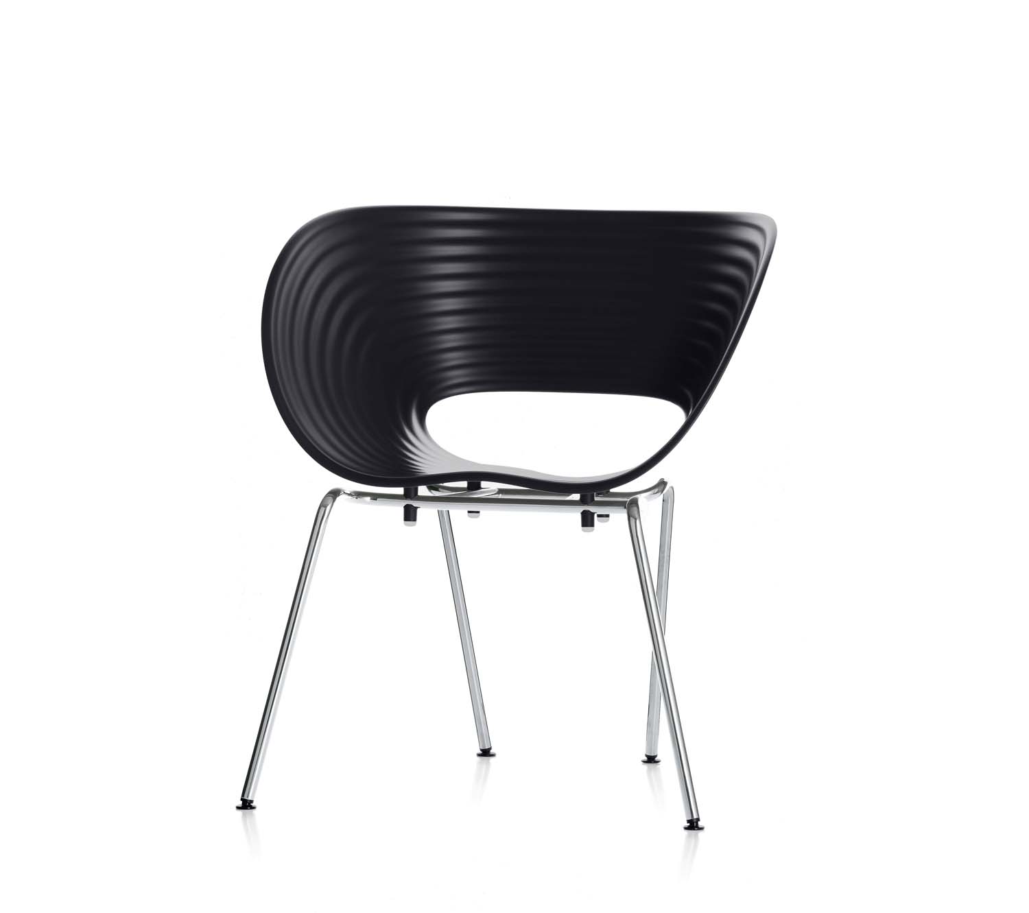 De schaal van de Vitra Tom Vac design stoel is vervaardigd uit hoogwaardig kunststof en is verkrijgbaar in de kleuren basic dark en wit. Het buizen frame waar de schaal op rust is zilverkleurig gepoedercoat, wat ervoor zorgt dat het metaal bestand is tegen de elementen en de stoel een heel kwalitatieve uitstraling geeft. Hoewel Vitra aangeeft dat de Tom Vac design stoel geschikt is voor buitengebruik geven wij geen garanties wat betreft het langdurig buiten gebruiken van de stoel, het kan namelijk zijn dat verkleuring optreedt als gevolg van langdurige blootstelling aan zonlicht.